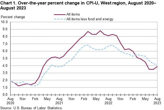 Prices in the West Region, as measured by the Consumer Price Index for All Urban Consumers (CPI-U), increased 0.4 percent in August, the U.S. Bureau of Labor Statistics reported today. (See table A.) The August increase was influenced by higher prices for gasoline and shelter. (Data in this report are not seasonally adjusted. Accordingly, month-to-month changes may reflect seasonal influences.)