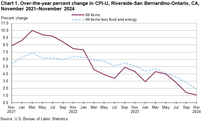 Prices in the Riverside area, as measured by the Consumer Price Index for All Urban Consumers (CPI-U), declined 0.2 percent for the two months ending in November 2024, the U.S. Bureau of Labor Statistics reported today. (See table A.) Regional Commissioner Chris Rosenlund noted that the November decrease was influenced by lower prices for apparel. (Data in this report are not seasonally adjusted. Accordingly, bi-monthly changes may reflect seasonal influences.)