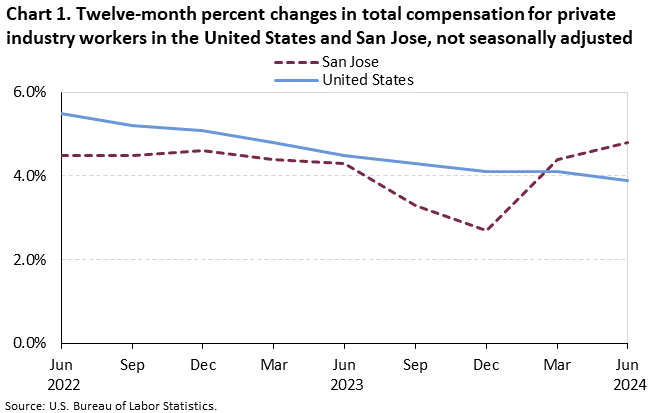 Compensation costs for private industry workers increased 4.8 percent in the San Jose-San Francisco-Oakland, CA Combined Statistical Area (CSA) for the year ended June 2024, the U.S. Bureau of Labor Statistics reported today. Regional Commissioner Chris Rosenlund noted that one year ago, San Jose-San Francisco-Oakland experienced an annual gain of 4.3 percent in compensation costs. (See chart 1 and table 1.) Locally, wages and salaries, the largest component of compensation costs, advanced at a 5.2-percent pace for the 12-month period ended June 2024. (See chart 2.) Nationwide, compensation costs rose 3.9 percent and wages and salaries rose 4.1 percent over the same period.