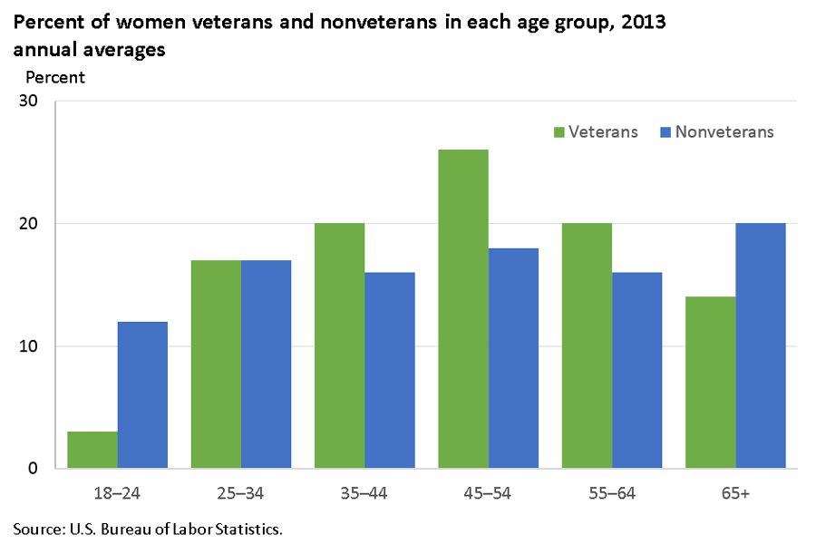 Employed women veterans were slightly more likely than employed nonveterans to work in management, professional, and related occupations in 2013 (48 percent and 42 percent, respectively), although this was the most common occupational group for veterans and nonveterans alike. Among employed women, veterans were less likely than nonveterans to work in service occupations (15 percent versus 22 percent). Similar shares of employed women veterans and nonveterans worked in sales and office occupations; production, transportation, and material moving occupations; and natural resources, construction, and maintenance occupations.